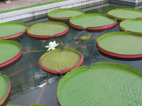 オオオニバス 花は前日の夕方ごろから咲き、咲き始めは白色で強く香り、翌朝にはピンク色に変化していきます。