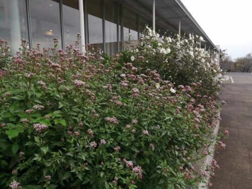 エントランス付近ではフジバカマが咲いていました。アサギマダラという蝶が集まる花として知られています。人間には感じられない蝶達だけが感じる香りがあるようですね。人間はフジバカマの落葉を嗅いでみてください。桜餅のような甘い香りがしますよ。
