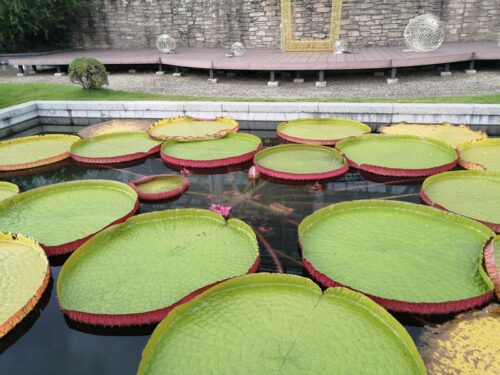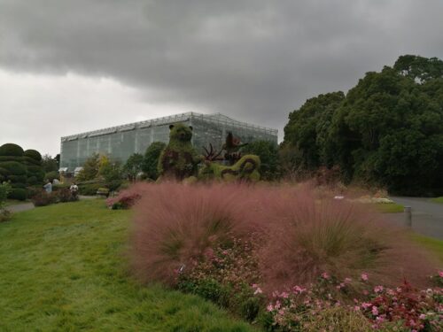 ふわふわのミューレンベルギアの花壇の先に池いっぱいに広がったオオオニバスがあります。中心部をよく見ると白い花弁を少し覗かせたラグビーボールのような蕾がありました。周辺に甘~い香りが漂っていて、今晩咲きそうです。この甘い香り、フラワーパークで一番魅了される香りだと思います。タイミングが合えばぜひ嗅いでみてください。
