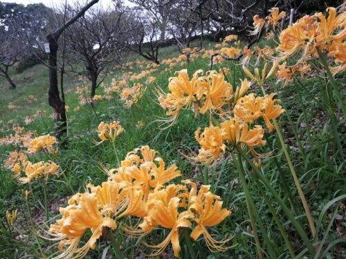 梅園の斜面ではショウキズイセンが咲いています。大ぶりな黄色い彼岸花。