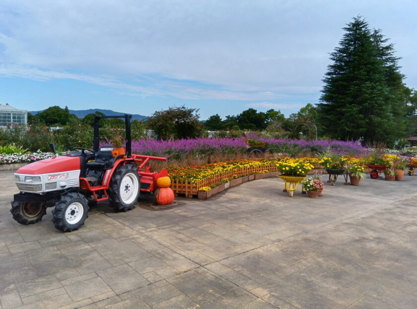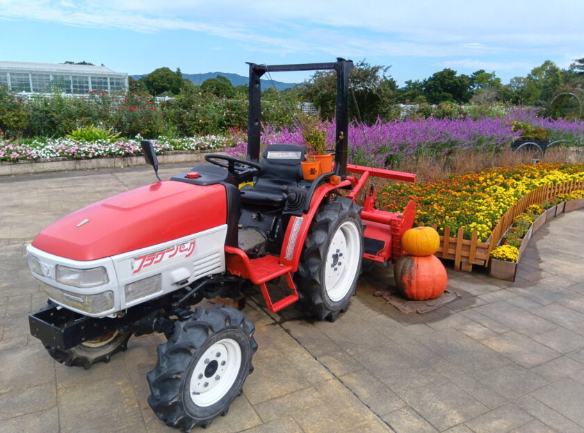 フラワーパーク正面入り口から入ると広がっていますエントランス広場では、真っ赤なトラクターがジャンボかぼちゃと並んでお出迎えです。