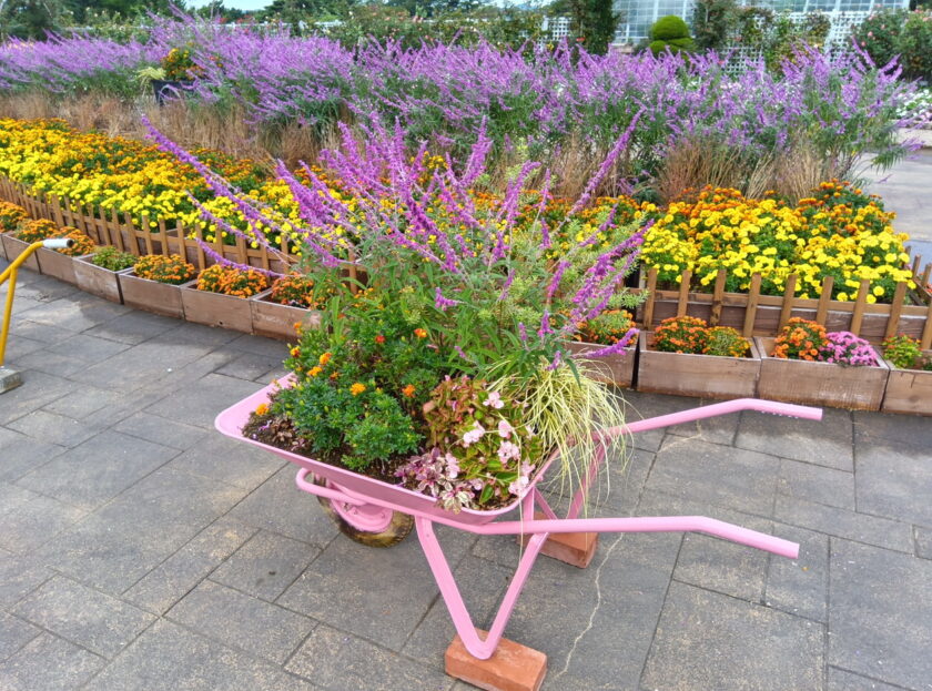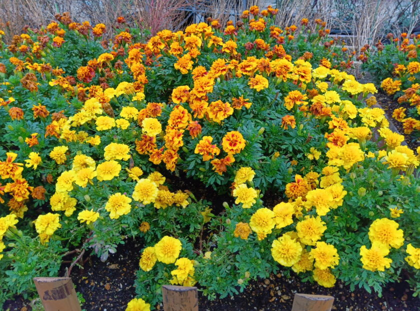 エントランス広場の中心ではフワフワした紫色の花を咲かせたアメジストセージと、マリーゴールドがご覧いただけます。トラクターの耕運跡に花を咲かせていています。フォトスポットになってます。
