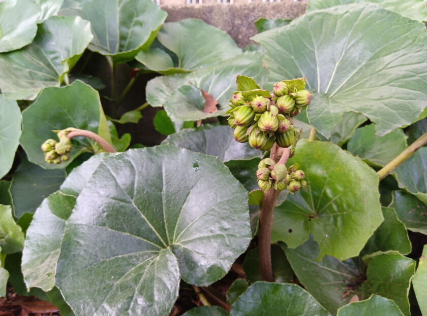 秋を代表する樹にキンモクセイがあります。例年より少し咲き始めが遅かったように思いますので、今週末も花をご覧いただけると思います。キンモクセイの後を継ぐのがツワブキで蕾が大きくなって準備中。