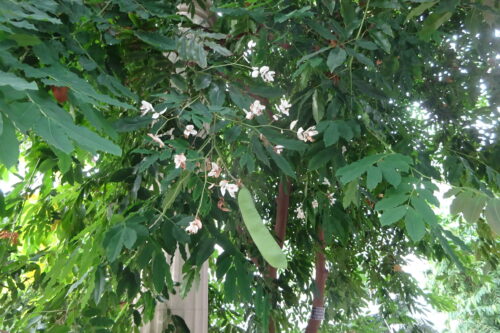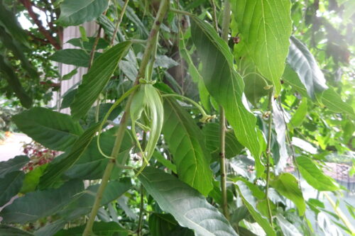 イランイランノキ、先月から例年以上に花をつけ、すぐ近くで見られる花も、まだ残っています。