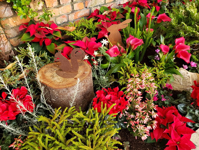 クリスマスの定番ポインセチアがたくさんのガーデンでカラーも赤基調ですがコニファーも多く使用し