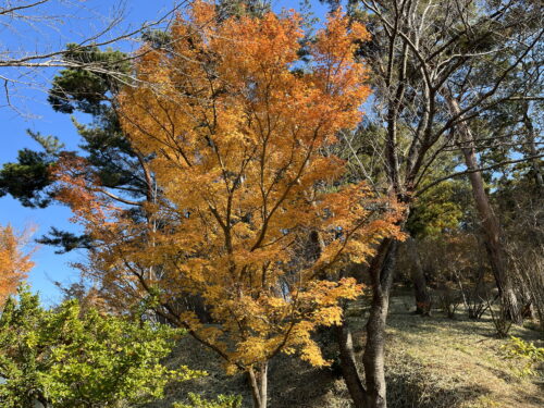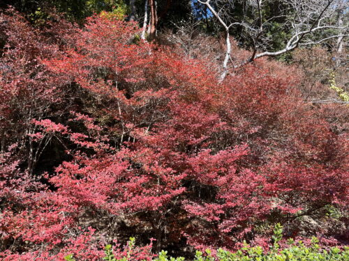 原種ツツジ園北側の”舞森”という品種のモミジになります。山林内の中では日当たりが良いこともあり、赤色の鮮やかさがあります。この品種は春になると斑入りの葉を展葉させることもあり、春モミジも楽しめる品種です。
