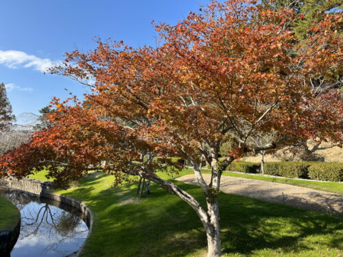 池水流沿いの”野村”モミジになります。こちらの品種は夏の間も赤紫の色合いをしている品種で秋になると橙~赤色に変化していきます。1年を通して赤色の変化を楽しめるのが個人的に好きなところです。