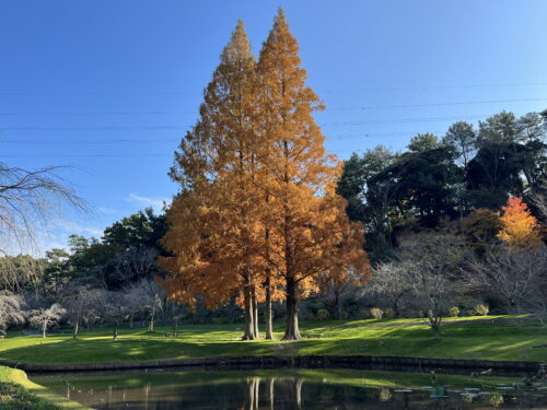 テラス池南側のメタセコイヤの木の紅葉です。現在見頃を迎えており、遠目に見ても存在感のある立ち姿をしています。
