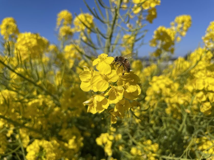 エントランスで展示されている菜の花です。春と勘違いしたのか、ミツバチやハナアブが花粉を集めていて可愛らしい姿を観察できました。