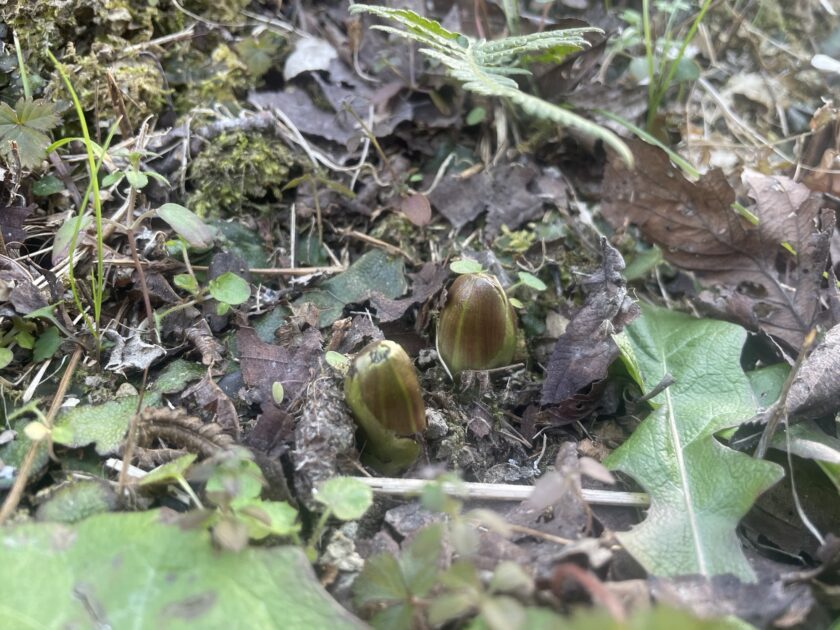 福寿草:早春には黄色い大輪を咲かせます。蕾が顔を出していました、ぜひ探してみてください。