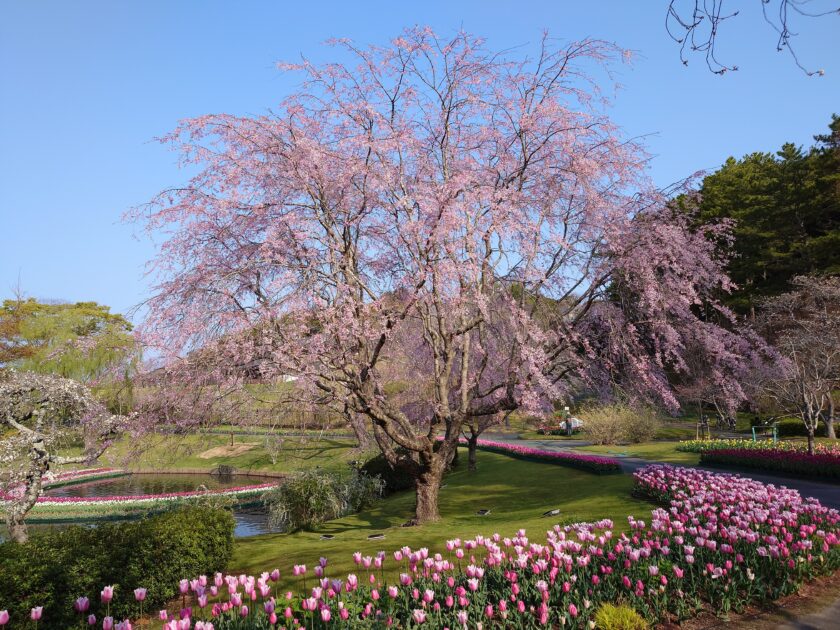 ピンクのチューリップが咲く花壇とソメイヨシノ、どちらを主役にするか迷ってしまいます。
