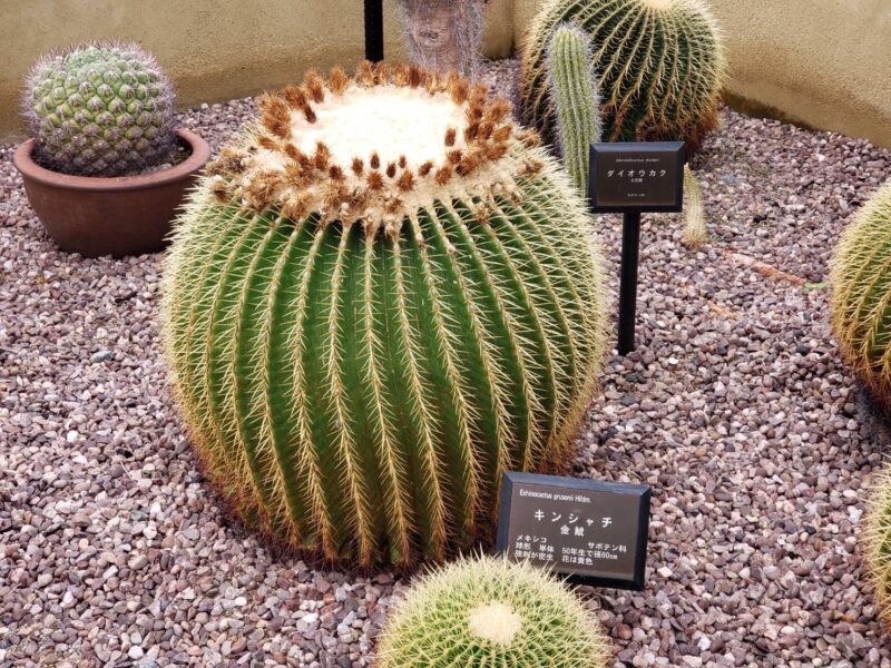 | スタッフこぼれ話 | メキシコ原産。 球形・単体 50年生で径60㎝になります。強刺が密生し、黄色い花が咲きます。 |