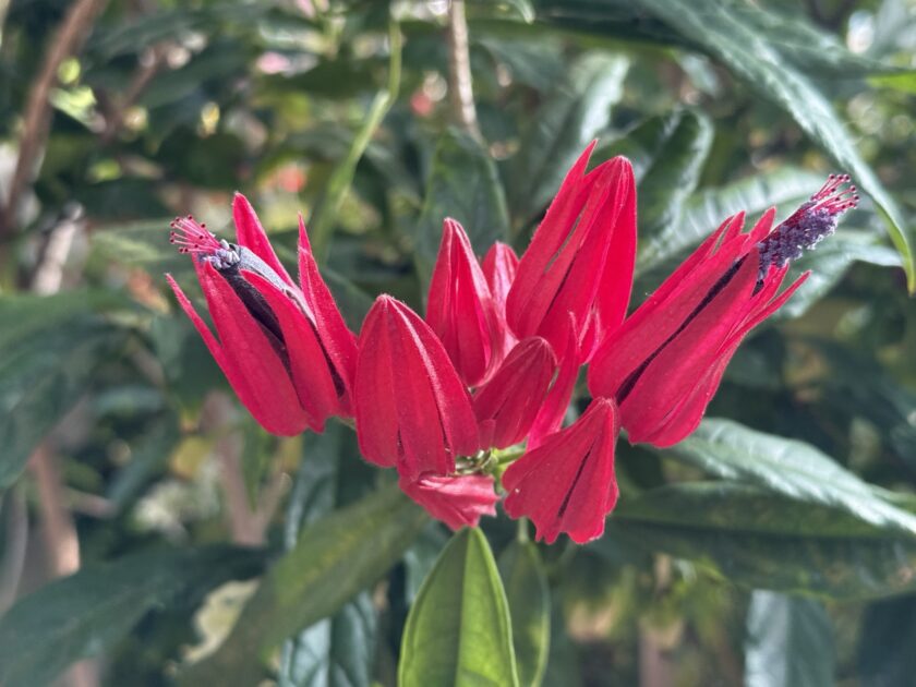 赤く美しく見える部分が「苞(ほう)」と呼ばれる部分で、中心の紫褐色が花弁となります。