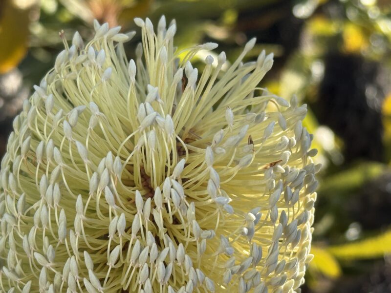 花序はブラシのような穂状になっている。実は硬く、山火事にあうと殻がはじけタネが飛び出す。