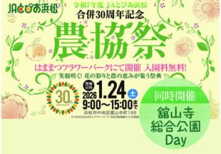 第4回 舘山寺総合公園Day ・農協祭1/24(土)【開園時間】 9:00~15:00(最終入園14:30まで) JAとぴあ浜松(HP)農協祭 『舘山寺総合公園』は、はまま…