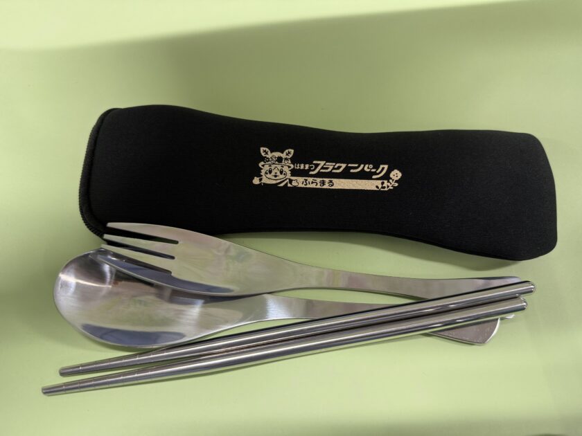 ※豚汁の画像はイメージです。「カトラリーセット」の内容物は下記画像のセット(スプーン、フォーク、箸(いずれもステンレス製)、チャック付きオリジナルケースの4点セット)となります。